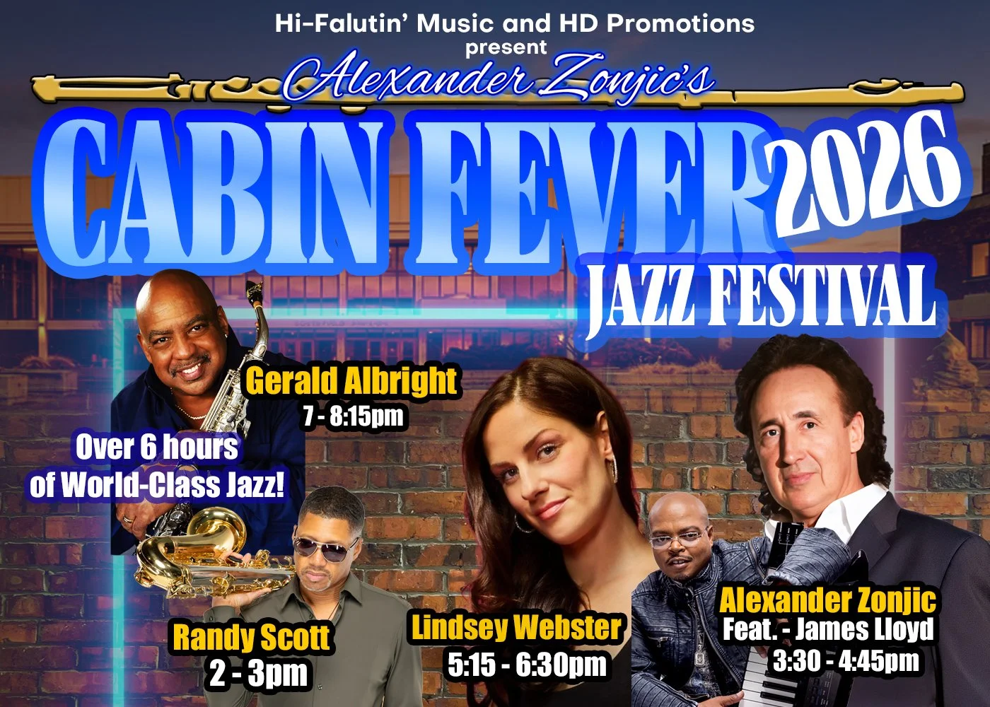 The 12th Annual Cabin Fever Jazz Festival! Over 6 hours of world-class jazz. Just like our outdoor festival, but indoors.